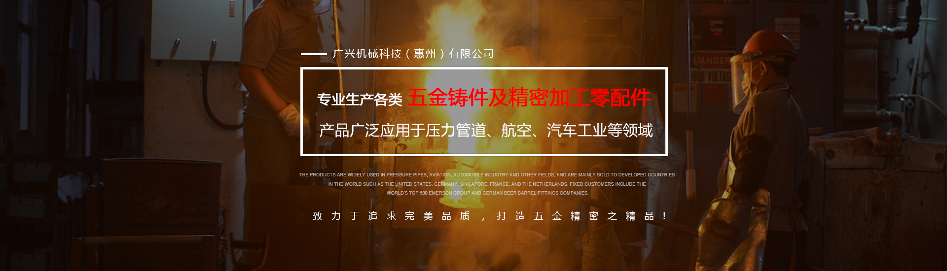 公司專(zhuān)業(yè)生產(chǎn)各類(lèi)五金鑄件及精密加工零配件,可熔煉材質(zhì)為全系列不銹鋼及碳鋼,主要生產(chǎn)材質(zhì)有304、316、316L17-4、430409等,年生產(chǎn)各種不銹鋼鑄件1000余噸。產(chǎn)品廣泛應(yīng)用于壓力管道、航空、汽車(chē)工業(yè)等領(lǐng)域,主要銷(xiāo)往美國(guó)、德國(guó)、新加坡、法國(guó)、荷蘭等世界發(fā)達(dá)國(guó)家,固定客戶(hù)有世界500強(qiáng)艾默生集團(tuán)及德國(guó)啤酒桶配件公司。